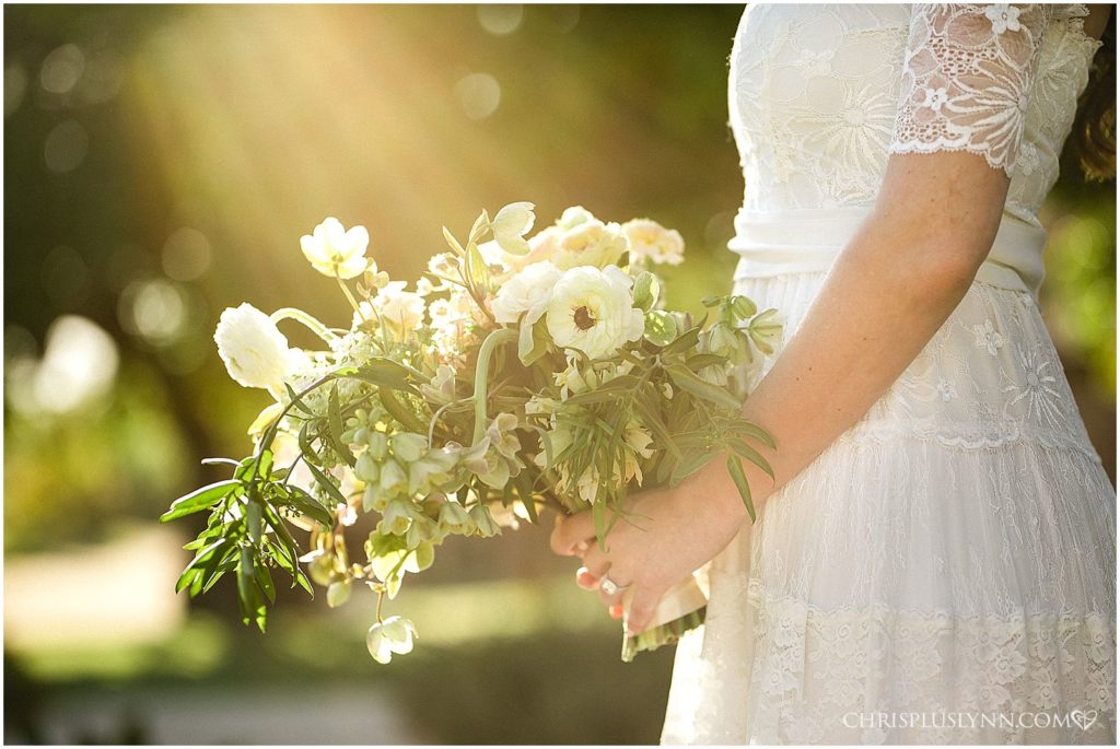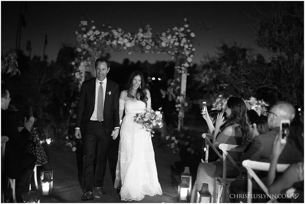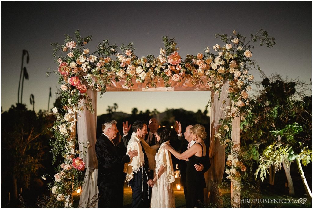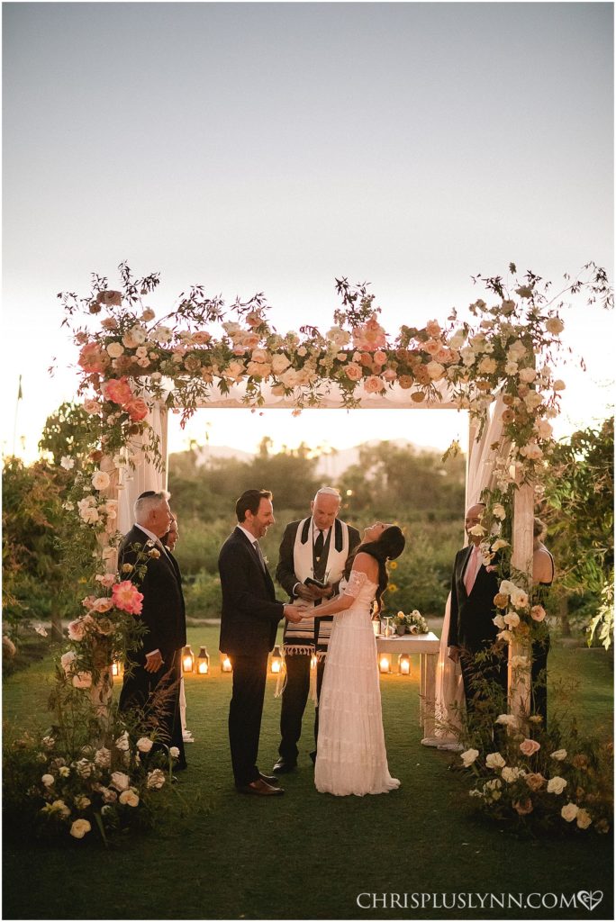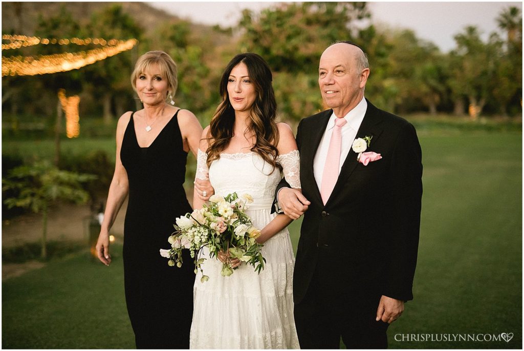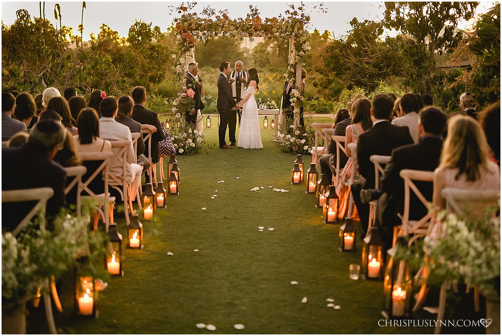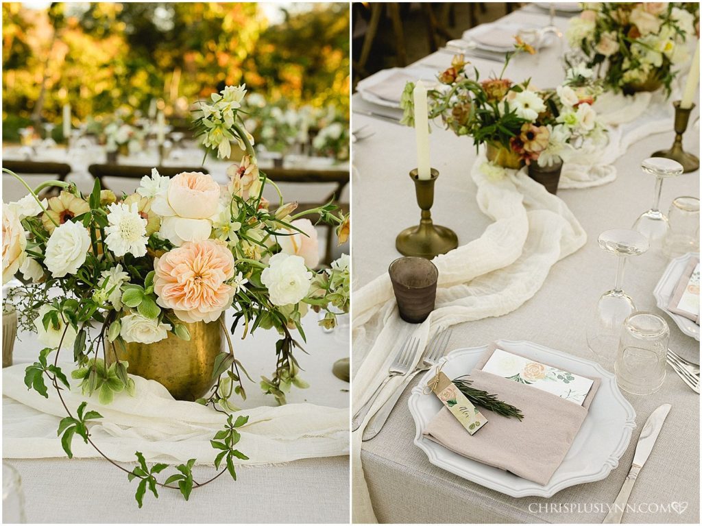 Signature Mexico created such a magical backdrop for the couple’s ceremony! In keeping with the pastoral setting at Flora Farms, they kept the ceremony and reception decor simple with whitewashed wooden chairs, terra-cotta urns, swathes of white muslin, and accents of antique brass. Wild greenery with unstructured florals in whites, creams, and shades of blush adorned the long wooden tables by the barn. Oh, and the candles! Their warm glow at the ceremony and the reception created such an ambience of warmth and love. Especially for a ceremony taking place during and after sunset, we can’t emphasize enough: the more candles the better!