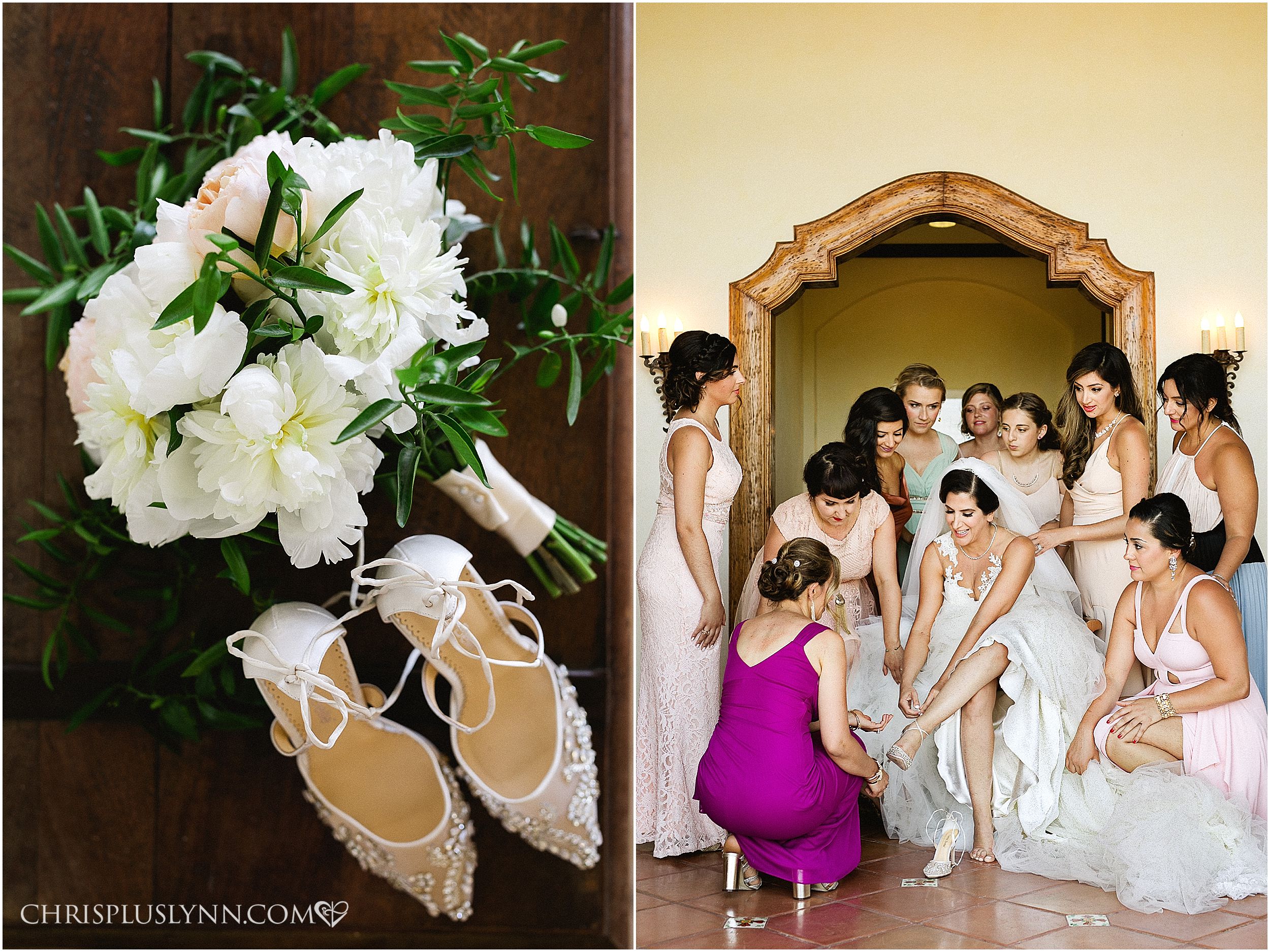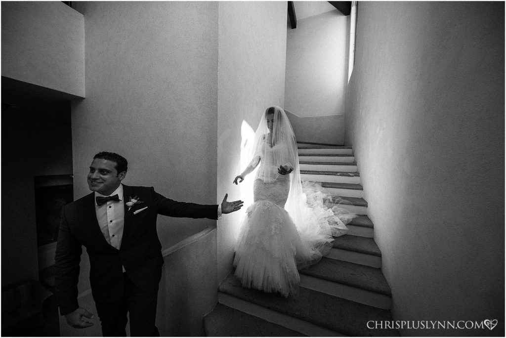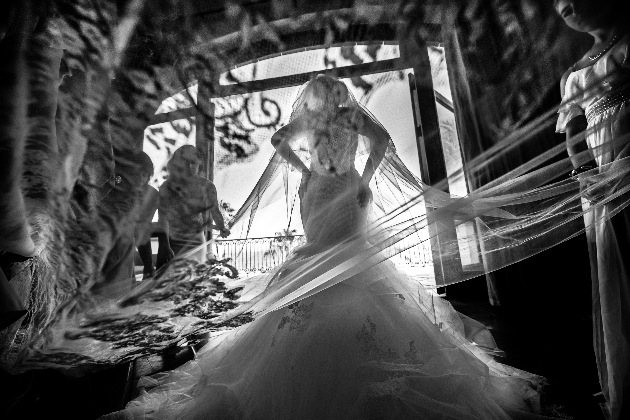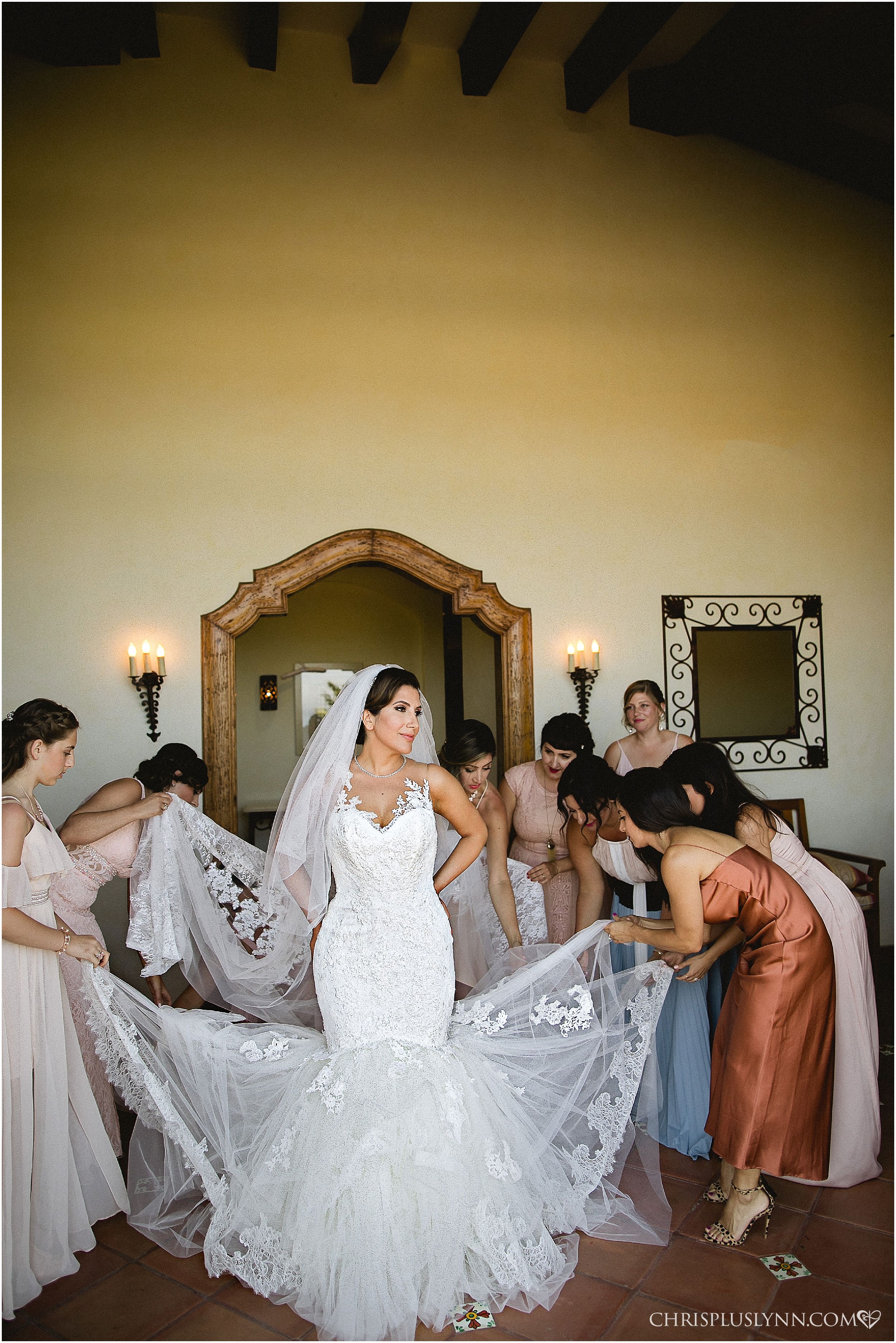 One of our favorite images of the day is from this moment when the bride’s wedding veil is being adjusted by her bridesmaids. I love how the low perspective combined with the veil’s intricate lace design, sheerness, and fold lines create a dynamic sense of movement and capture the anticipation.